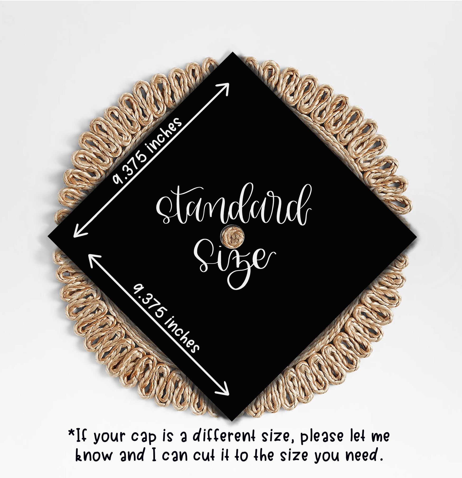 Each cap topper is 9.375 inches x 9.375 inches with a hole cut for the button at 0.80 inches (standard size). The design is “flush” (completely flat) with the physical graduation cap while the tassel goes around the button on top of the design. There should be no gap(s) between the topper and the physical graduation cap once attached.